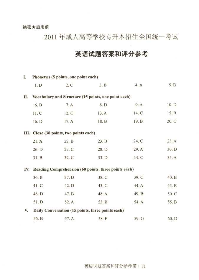 2011年全国成人高考专升本《英语》试题及答案